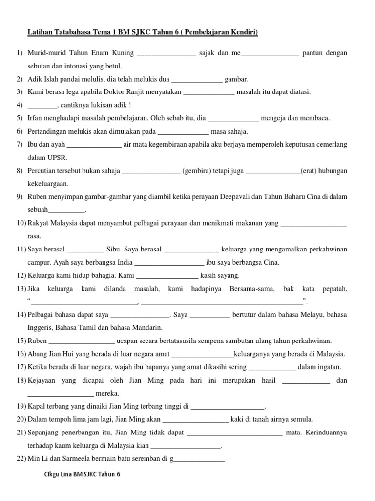 Latihan Tatabahasa Tema 1 Bm Sjkc Tahun 6 Pembelajaran Kendiri Pdf
